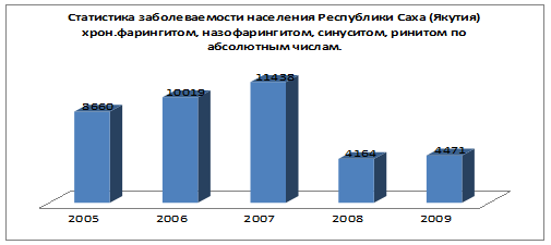Заболевания органов верхних дыхательных путей и уха, которая особенно актуальна в Республике Саха (Якутия) в силу климатических условий, низкого социально-экономического уровня жизни населения, экологической ситуации. Патология органов дыхания занимает основное место в структуре заболеваемости населения Республики Саха (Якутия), а среди них воспалительные заболевания носа и околоносовых пазух. В последние годы отмечена тенденция к росту заболеваемости острыми синуситами, достоверно увеличилось количество больных с хроническими синуситами (Минздравоохранения РС(Я) от 12.11.2009 № 01-8/4-1351). В структуре оториноларингологических болезней в РС(Я) 1 место занимают болезни носа и околоносовых пазух, 2 место - заболевания глотки, 3 место - заболевания органов слуха. Статистика заболеваемости населения Якутии в абсолютных числах наиболее частыми ЛОР - болезнями приведена ниже.