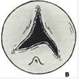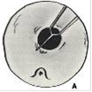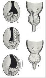 Рис.23. Инцизия простаты. А - Рубцово-склеротическое сужение шейки мочевого пузыря, обусловленное ДГП небольших размеров. В - Инцизия простаты крючковидным электродом на 7 часах условного циферблата. В - Вид задней уретры после инцизии простаты на 5, 7 и 12 часах условного циферблата. Широкое раскрытие шейки мочевого пузыря