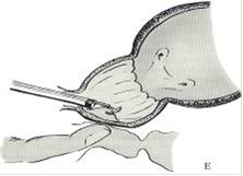 Рис.22. Открытая перфорация простаты. Путь распространения ирригационной жидкости (стрелка) в парапростатическое (паравезикальное) пространство.