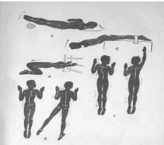 Вытягивание руки вверх с вогнутой стороны искривления влечет за собой изменение положения плечевого пояса и выравнивает грудной отдел позвоночника (рис. 3, г). Отведение ноги на стороне выпуклости поясничного отдела позвоночника ведет к смещению таза и к коррекции бокового искривления (рис. 3, д). При 8-образ-ной форме искривления эти способы коррекции сочетаются. Коррекция торсионных изменений достигается поворотом таза путем заведения ноги при локализации основной кривизны в поясничной части позвоночника. Раскручиванию грудного отдела позвоночника путем поворота туловища способствует отведение руки.