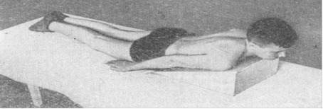 Действие физических упражнений закрепляет лечение положением - укладка больного на живот с клиновидной подставкой под грудную клетку (рис. 5) и на спину вдоль гимнастической скамейки с разведенными в сторону руками для растяжения больших грудных мышц. Выравниванию положения корпуса при сидении помогает косое расположение крышки стола (по типу чертежной доски) под углом 30° и несколько отклоненная назад спинка стула в пределах 10°.