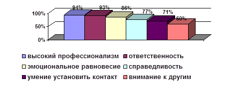 Согласно результатам опроса респондентов в On-Lain режиме «Какими качествами должен обладать руководитель сестринской службы?», были указаны следующие качества: высокий профессионализм, ответственность, инициативность, эмоциональное равновесие, стрессоустойчивость, терпение, сдержанность, добросовестность, честность, справедливость, внимательность и сострадание другим. На наличие высокого профессионализма, которым должен обладать менеджер указали 66 респондентов [94 %], обязательно быть ответственным и инициативным - 65 человек [93 %]. 60 человек [86 %] лиц отметили, что руководитель должен обладать эмоциональным равновесием, стрессоустойчивостью, сдержанностью и терпением. На такие качества как честность и справедливость указали 56 опрошенных респондентов [77 %]. За умение общаться, устанавливать контакт с окружающими (как с коллегами, так и с пациентом) высказались 50 человек [71 %], быть внимательным к другим - 42 респондента [60%] [рисунок 18].