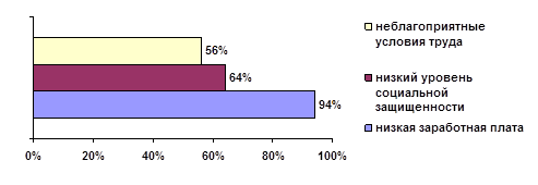 На вопрос: «Какие социальные факторы влияют на профессиональную успешность?» подавляющее большинство респондентов 66 человек [94 %] ответили, что считают оплату своего труда низкой, не регулирующейся с учетом уровня образования, отсутствие системы стимулирования по конечным результатам деятельности, а также и низкую социальную защищенность. Немаловажным фактором респондентами отмечены условия труда, которые оказывают существенное влияние на организм человека, физиологическое и психологическое функционирование во время трудовой деятельности. В более половины случаев [39 человек - 56 %] были отнесены напряженный график работы, большие нагрузки, что приводит к переутомлению и накоплению усталости. Низкий уровень социальной защищенности отметили 45 респондентов [64 %] [рисунок 20].
