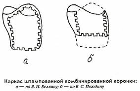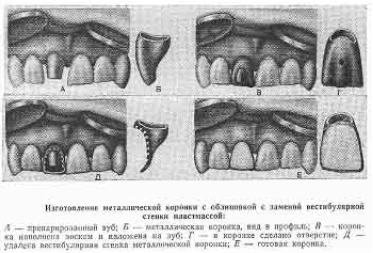 Первым подобные коронки предложил З.И. Белкин (кафедра ортопедической стоматологии Ленинградского стоматологического института). В этом случае при препаровке снимают несколько больше тканей с вестибулярной и апроксимальных поверхностей. Далее все происходит точно так же, как и при изготовлении обычной штампованной коронки вплоть до момента примерки в полости рта. После примерки врач проделывает бором небольшое отверстие в вестибулярной поверхности коронки, заполняет ее разогретым воском и надевает на зуб. Излишек воска выдавливается через отверстие. Не снимая коронки, снимают оттиск со всего зубного ряда, в который и переходит коронка, и отливают модель. Коронка переходит на последнюю. В лаборатории техник коронку снимает, обрабатывает, и выпиливает окно на вестибулярной поверхности с ретенционными пунктами по краю. Одевает коронку на модель и моделирует воском вестибулярную поверхность. Далее, вырезав фрагмент модели включаюший коронку и два соседних зуба ее гипсуют прямым методом в кювету, и заменяет воск на пластмассу. К примеру, Синма М. Далее пластмассовую облицовку обрабатывают и полируют. И фиксируют в полости рта.