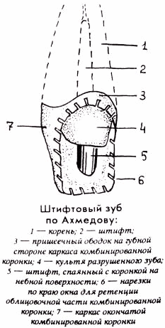 А.А. Ахмедов предложил соединять коронку по Белкину со штифтом. И применять эту конструкцию в тех случаях, когда разрушение культи зуба составляет не более одной трети высоты коронки.