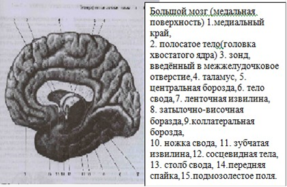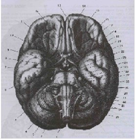 .спинной мозг, 2.Iшейный нерв, 3.мозжечок, 4.подъязычный нерв, 5.сосудистое сплетение, 6.ножка мозга, 7.заднее продырявленное вещество, 8.межножковая ямка, 9.серый бугор, 10.воронка, 11.гипофиз, 12.прямая извилина, 13.обонятельная борозда, 14.обонятельная луковица, 15.обонятельный тракт,16.зрительный нерв,