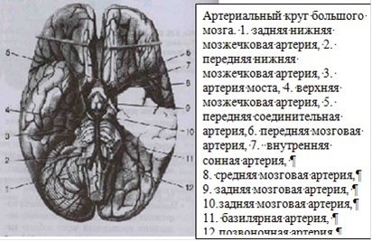 Артериальный круг большого мозга образуют следующие основные сосуды: спереди- непарная передняя соединительная артерия, с переднебоковой стороны- передняя мозговая артерия, с наружной стороны- задняя сообщающаяся артерия, сзади - задняя мозговая артерия.