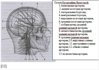 По предложению С.С. Брюсовой схему Кронляйна дополняют верхней горизонтальной линией, которую проводят параллельно нижней и средней горизонтальным линиям через точку пересечения проекция переднее мозговой артерии. Проекция задней мозговой артерии соответствует участку средней горизонтальной линии между средней и задней вертикальными линиями.