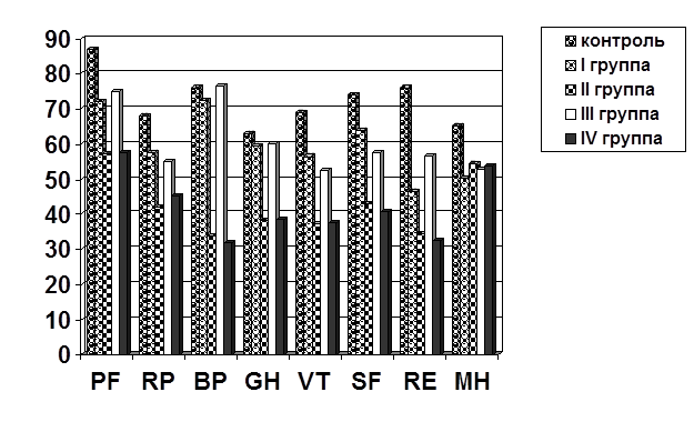 Полученные данные указывают на значительное ухудшение КЖ во всех группах по сравнению с контролем (рис.1). При этом показатели КЖ в I и III группах не имели значимых статистических различий между собой. Аналогичную картину мы также наблюдали во II и IV группах. По сравнению с аналогичными показателями, показатели КЖ у больных с ПА (II, IV группы) оказались значительно ниже, чем у больных с РВП (I и III группы), особенно по шкалам, формирующих «физический компонент здоровья» (рис.1).