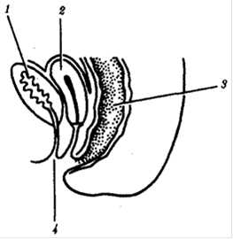 -мочевой пузырь, 2-матка, прямая кишка, 4-клоака