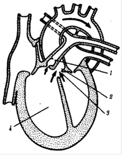 -стеноз легочного ствола. 2-транспозиция аорты, 3-дефект межжелудочковой перегородки, 4-гипертрофия правого желудочка; стрелками показано направление движения крови
