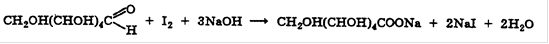 Содержание глюкозы определяют иодометрическим методом, основанном на окислении альдегидной группы щелочными растворами иода до образования натриевой соли глюконовой кислоты: