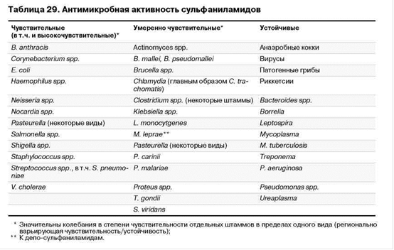 Сульфаниламиды обладают широким антимикробным спектром действия (табл. 2). Большинство сульфаниламидов влияет на грамотрицательные энтеробактерии (эшерихии, сальмонеллы, шигеллы, клебсиеллы), грамположительные кокки (кроме энтерококков и зеленящего стрептококка) и нейссерии. Также активны в отношении возбудитетелей сибирской язвы, дифтерии, чумы, а также клебсиеллы, актиномицетов и некоторых других микроорганизмов. Сульфапиридазин и сульфамонометоксин дополнительно оказывают действие на хламидии, токсоплазмы, протей, нокардии и плазмодии малярии,а также при неспецифическом язвенном колите и болезни Крона. Вторичная резистентность к микроорганизмам развивается достаточно быстро.