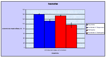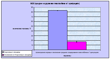 Гемоглобин при ЖДА имеет тенденцию к снижению. В норме он содержится у мужчин (132-173 г/л), у женщин (117-155 г/л). По показателям диаграммы заметно, что большее снижение гемоглобина наблюдается у женщин. Это можно объяснить тем, что в группу риска попадают женщины в фертильном возрасте, а это основная масса женского населения. Нарушение синтеза гемоглобина возможно в результате нарушения - включения в его молекулу железа при нормальном или даже повышенном уровне железа в сыворотке крови. Еще одной причиной дефицита железа, приводящего к развитию ЖДА, может быть нарушение транспорта железа, обусловленное снижением в крови уровня трансферрина.