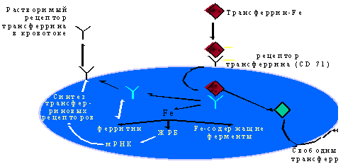 При повышенной потребности в железе, цикл рецептора Tf ускоряется и все больше рецепторов располагается на поверхности клетки. При этом все чаще внеклеточная часть рецептора подвергается воздействию протеаз, в результате чего от рецептора отделяется и попадает в кровь довольно стабильный фрагмент - пептид с молекулярным весом 95 кД, называемый «растворимым» рецептором трансферрина (sTfR), концентрацию которого в сыворотке крови можно определить при помощи иммунологических методов.