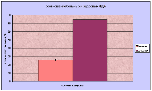 Результаты, полученные по диаграмме процентного соотношения больных и здоровых ЖДА, оказались такими, что приблизительно 75% исследуемых пациентов оказались здоровыми, а у 25% наблюдаются симптомы ЖДА, что совпадает с литературными данными.