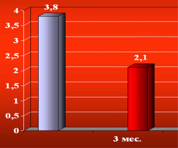 Рис. 21. Динамика среднего функционального класса стенокардии до и через 3 мес. после сочетанных операций ТМЛР с методами прямой реваскуляризации миокарда