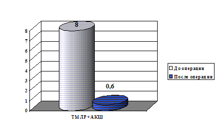 Рис. 22. Динамика выявления признаков преходящих ишемических изменений до и после операции ТМЛР в сочетании с АКШ.