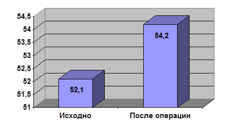 Для выявления зон нарушения локальной сократимости миокарда ЛЖ после операции анализу подверглись 2160 сегментов. Из них нормальную сократительную способность имели 1752 (81.1%) сегментов и в гипокинезе были 408 сегментов (18.9%). Значит, в среднем на одного обследованного пациента после операции приходилось 3.4 ± 0.8 гипокинетичных и 14.6 ± 0.8 нормокинетичных сегментов; индекс нарушения сегментарной сократимости по сравнению с дооперационным достоверно возрос и составил в среднем 1.2 ± 0.04.