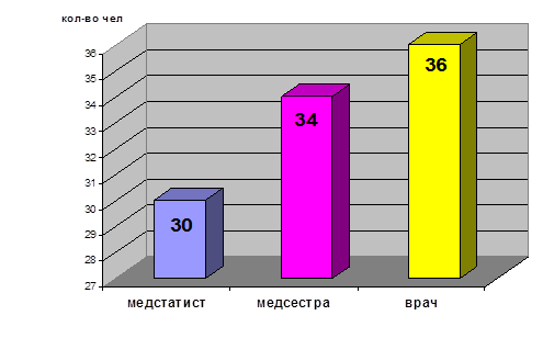 Представленные на рисунке 1 данные свидетельствуют о том, что большую часть среди респондентов составляли врачи - 36%, медсестры - 34%, медстатисты - 30%.