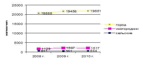 Представленные на рисунке 9 данные демонстрируют, что контингент поступающих остается примерно одинаковым. Был отмечен рост поступающих иногородних граждан в 2009 году, и небольшой спад поступающих сельских граждан в том же 2009 году. Количество поступающих городских жителей по сравнению с 2008 годом увеличилось на 4%.