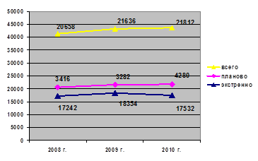 Представленные на рисунке 10 свидетельствуют о том, что в период с 2008 по 2010 гг увеличилось число пациентов подлежащих плановой госпитализации (на 25%), при этом уменьшилось количество пациентов госпитализировавшихся в экстренном порядке с 2009 по 2010 гг этот показатель уменьшился на 5%.