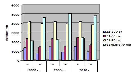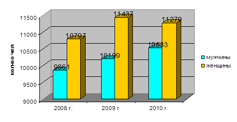 Представленные данные на рисунке 11 свидетельствуют о том, что среди госпитализировавшихся пациентов преобладают женщины. При этом следует отметить, что в 2008 году женщин госпитализировалось больше на 936 человек; в 2009 году - на 1238 человек; в 2010 - на 746 человек. Рост госпитализировавшихся мужчин с каждым годом имеют тенденцию к увеличению.