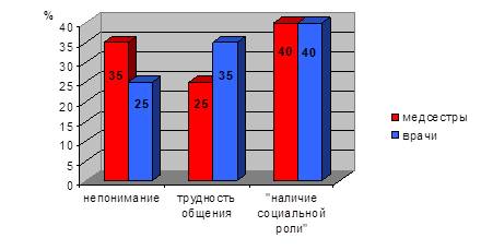 Представленные на рисунке 17 данные о трудностях при сотрудничестве со специалистами, имеющими высшее сестринское образование свидетельствуют о том, что большая часть врачей и медсестер (по 40%) не понимают полного значения и функциональных обязанностей специалистов с ВСО, поэтому и приписывают профессиональную некомпетентность «социальной роли», также были отмечены трудности в общении с медсестрами (25%) с врачами (35%).