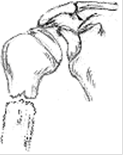 2. При чисто абдукционном переломе отломки образуют угол открытый кнаружи. При этом проксимальный конец дистального отломка имеет тенденцию полностью смещаться по ширине и, смещаясь по длине, погружаться в подмышечную впадину. При этом может возникать повреждение магистральных нервно-сосудистых образований.