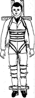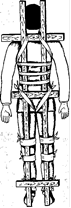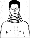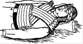 4) бинтами фиксируют шину к туловищу, а затем голову к верхнему изгибу шины. При этом, помощник осторожно освобождает кисти, начиная оказывать вытяжение за задний и передний отделы шины;