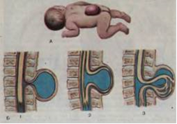 Спинномозговая грыжа-выпячивание мозговых оболочек, корешков и вещества спинного мозга через отверстие, образованное в результате врождённого незаращения позвоночника (А). Грыжи могут располагаться на различных уровнях.