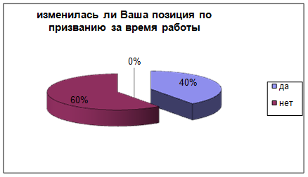 Анализ ответов на вопрос: “Изменилась ли Ваша позиция по призванию за время работы?”, показал, снижение числа медсестер, работающих без профессионального интереса. Это объясняется более углубленным вхождением в профессию (рис. 2)