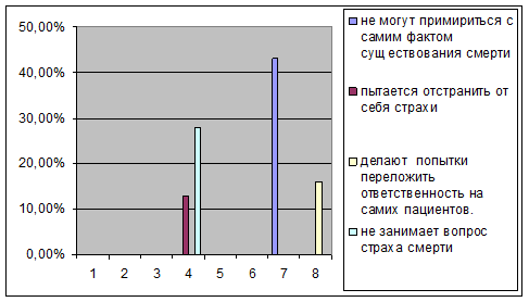 % медицинских сестер пытается отстранить от себя страхи, как только пациента касается дыхание смерти. 16% рационально мыслящих медицинских сестер делают попытки переложить ответственность на самих пациентов. В данном случае, на наш взгляд интерес представляет логические суждения медсестер: пациент сам виноват в своей смерти (“почему не соблюдал предписаний врача?”, “ почему не вел здоровый образ жизни”, “почему не бросил курить” и т. д.). И, наконец, самый интересный факт, по нашему мнению состоит в том, что 28% медицинских сестер вообще не занимает вопрос страха смерти они «никогда не чувствовали», “не отмечали”. Одним словом - реакция отрицания.