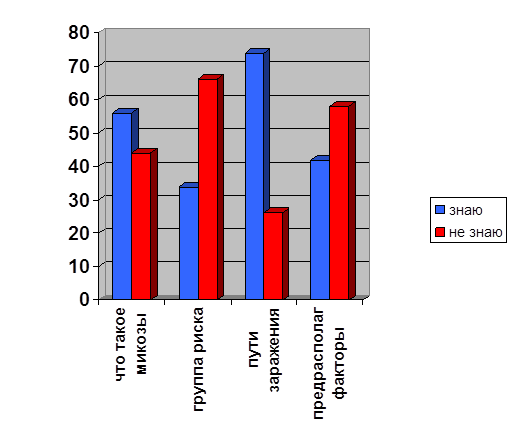 % опрошенных респондентов не знали о поверхностных микозах совсем ничего или знания были крайне недостаточными для того, чтобы понять значимость всей проблемы. Большая часть пациентов, что составило 68%, не знает, кто относится к группе риска. И даже среди знающих пациентов, группа риска является очень размытым и неопределенным понятием. О том, что имеются предрасполагающие факторы, знают так же далеко не все участники опроса. В ответах о путях распространения многие путаются и не могут определить, как происходит заражение грибковой инфекцией.