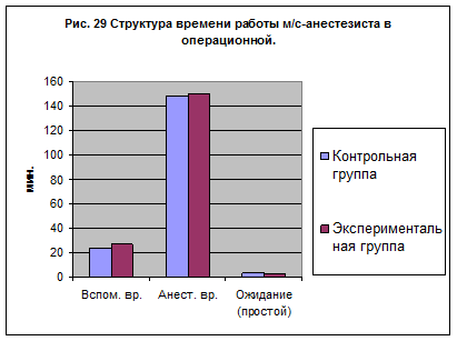 Из рисунка 29 видно, что основное время занимает работа связанная непосредственно с проведением анестезиологического пособия. Вторым по объёму является время необходимое для подготовки к проведению анестезиологического пособия, а так же для проведения необходимой работы после окончания операции.