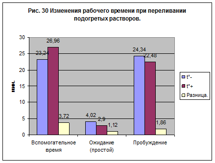 По данным диаграммы видно, что вспомогательное время для экспериментальной группы увеличилось на 3,72 мин. То есть время работы с аппаратом РП4-02, используемым для подогрева растворов, составило в среднем 3,72 мин. для одной операции.
