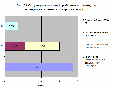 При рассмотрении структуры изменений рабочего времени (рис.31) видно, что для экспериментальной группы, период пробуждения уменьшился на 1,86 мин., а период ожидания на 1,12 мин.
