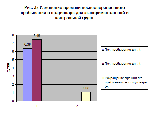 Из данных диаграммы (рис32) видно, что время пребывания в стационаре после операции для пациентов, которым интраоперационно переливали тёплые растворы сократилось в среднем по сравнению с контрольной группой на 1,08 суток.