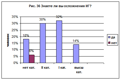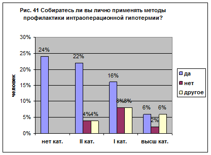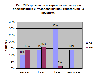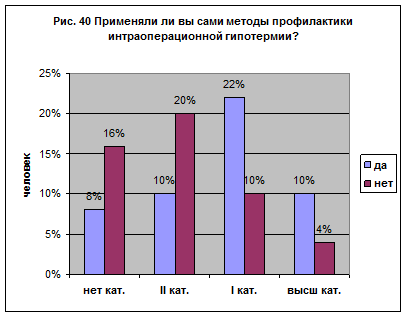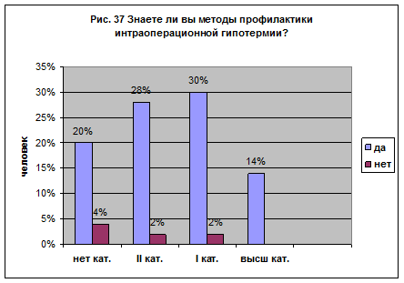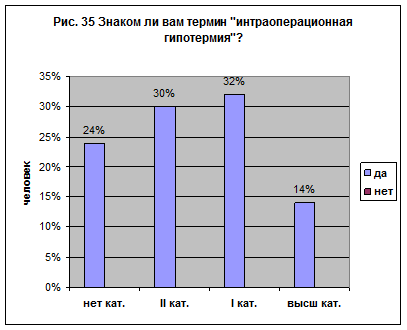Из рис.35 видно, что все медсёстры-анестезисты, независимо от квалификационной категории знакомы с понятием "интраоперационная гипотермия".