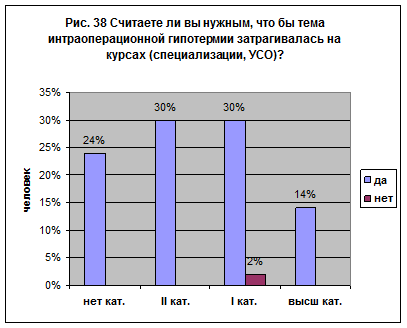 Считают, что тему интраоперационной гипотермии необходимо затрагивать на курсах УСО и специализации подавляющее большинство медсестёр-анестезистов. Отрицательно на данный вопрос ответило только 2 % (1 человек, имеющий I категорию).