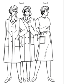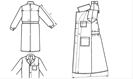 Халат типа Б - с застежкой на пуговицы или на завязках сзади, со швом или без шва посередине переда, с поясом, с внешними передним и боковыми карманами с обтачками на полочках, без воротника. Рукава одношовные втачные, длинные, с манжетами, застегивающимися на пуговицы.