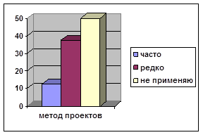 Активизировать самостоятельную познавательную деятельность обучающих и обеспечить их подготовку не только к деятельности исполнителя, но и самостоятельной постановке проблем, а также к деятельности исполнителя, но и самостоятельной постановке проблем, а также к самообразованию способствует метод проектов. По данным анкетирования регулярно применяют метод проектов 12,5% и не находят применения в своей работе 50% преподавателей (см. рис. 7).