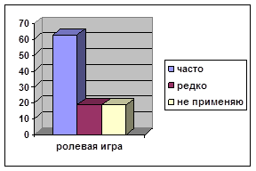 «Надо прогнать с уроков бога сна Морфея и чаще приглашать бога смеха Момуса» (Ш.А Амонашвили, 2001). Игровые технологии обучения отличаются исключительным разнообразием, поэтому относить их к какой-либо группе весьма сложно. Игровые формы (ролевая игра) отличаются тем, что здесь процесс обучения максимально приближен к практической деятельности. Сообразуясь с характером и интересами своей роли, учащиеся должны принимать практические решения. Чаще всего им приходится играть свою роль в конфликтной ситуации, заложенной в содержание игры. Решения во многих играх принимаются коллективно, что развивает мышление учащихся, коммуникативные способности. В процессе игры возникает определенный эмоциональный настрой, активизирующий учебный процесс (С.В. Кульневич, Т.П. Лакоценина, 2006). При использовании ролевых игр инсценируются условия воображаемой ситуации, а учащиеся играют определенные роли. Это сложная форма учебной деятельности, требующая большой подготовки и немалых затрат времени. Данный метод обучения используют в своей работе регулярно 62,4% преподавателей, а не находят применения и используют в своей работе редко по 18,8% (см. рис. 10).