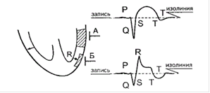 Рисунок 3. А - электрод, регистрирует зубец Q, Б - электрод, направленный на регистрацию зубца R).